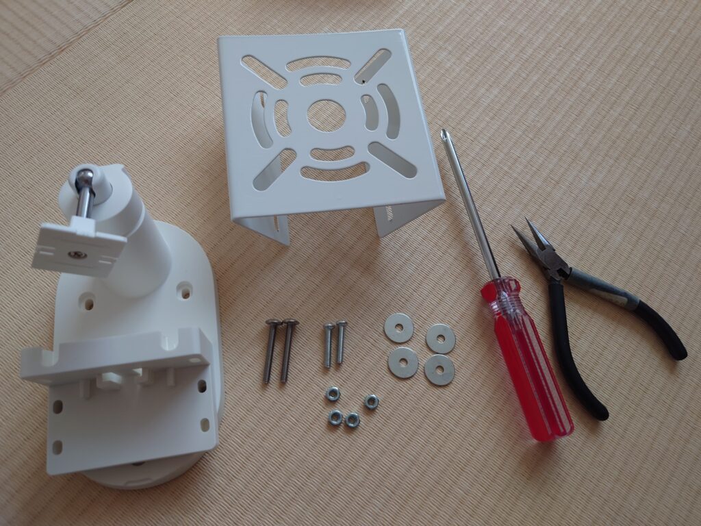 防犯カメラの土台と取付金具ブラケットを4本のボルト・ナット・ネジで固定(ラジオペンチでナットを押さえながらドライバーで締める)